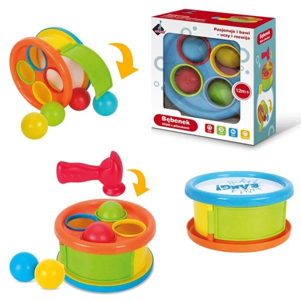 Zabawka z jednej strony posiada otwory w takich samych kolorach jak piłeczki, które należy wbić do środka plastikowym młotkiem. Druga strona oferuje muzyczną zabawę z bębenkiem. Boczna ścianka posiada możliwość otwarcia aby w łatwy sposób wyjąć piłki na zewnątrz. W komplecie znajduje się zbijak z bębenkiem, 4 plastikowe piłeczki, plastikowy młotek. Wymiary: 18.5x10x21 cm. Wiek: 1+.