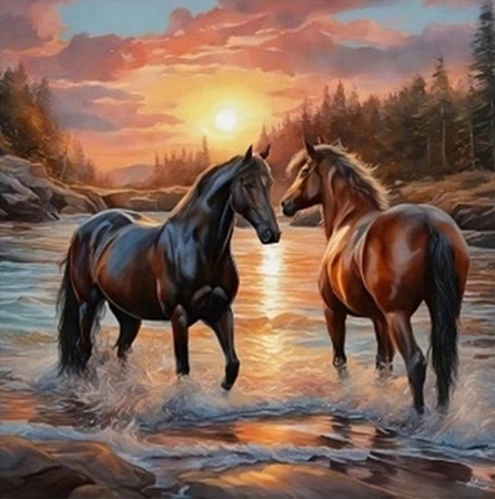 DIAMENTOWA MOZAIKA KONIE DWA NAD BRZEGIEM NA TLE ZACHODZĄCEGO SŁOŃCA P