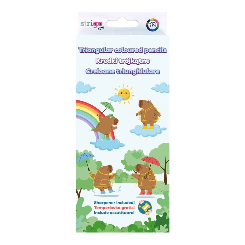 Kredki ołówkowe trójkątne STRIGO z serii Kapibara, temperówka, 12 kolorów